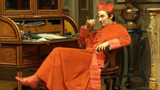 На этой картине мы видим молодого епископа, который развалился в кресле в вальяжной позе с ухмылкой на лице. В комнате, где сидит священнослужитель, богатый и изысканный интерьер, которые бывают только во дворцах. Перед епископом стоит роскошный секретер, на котором мы видим разложенные бумаги и листок, похожий на письмо. В руках у священнослужителя перо, но выражение лица у него такое, как будто он не решает будничные церковные дела, а пишет любовное послание даме сердца. Молодой человек одет в ярко-красную рясу, а позади него стоит ваза с роскошным букетом красных цветов...