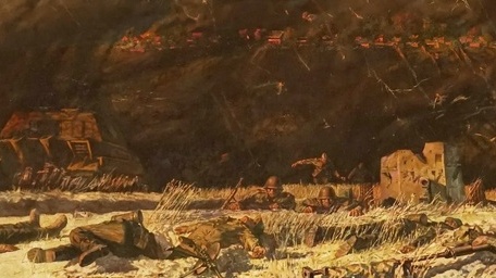Имею такую наглость заявлять… Художник Федюнин целую научную работу написал в пользу традиционной сюжетно-тематической картины. И привёл пример из своего творчества, говоря, что он реалист. – Вот этот. Федюнин. Сорокапятка – невзятая высота. 2012. Он пишет в позитивном тоне: «Процессы внутри живописного цеха, конечно же, не могут не быть [выделение моё] связаны и с изменениями в окружающей среде, как внешней, так и социальной. Во всяком случае – отчасти [это «отчасти» – крайнее разочарование или...