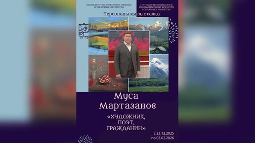 В государственном музее изобразительных искусств республики 23 декабря текущего года состоится открытие персональной выставки народного художника Ингушетии Мусы Мартазанова. По информации, предоставленной газете «Ингушетия» в пресс-службе культурно-досугового учреждения, в рамках экспозиции под названием «Художник, поэт, гражданин» будет представлено около 40 произведений живописи и декоративно-прикладного искусства. Муса Мартазанов — самобытный мастер, в творчестве которого соединяются изобразительное искусство, поэтическое восприятие мира и активная гражданская позиция...