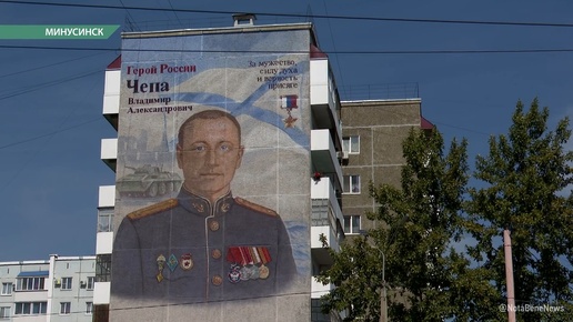 Он посвящен погибшему два года назад в бою, Владимиру Чепе. Он погиб в ходе специальной военной операции в Запорожской области. Его группа уничтожила подразделение ВСУ, а сам он пал в неравном бою. На открытие мурала был губернатор красноярского края. А местом для портрета 9-этажка выбрана не просто так, это фасад дома, где работает совет ветеранов Минусинска...
