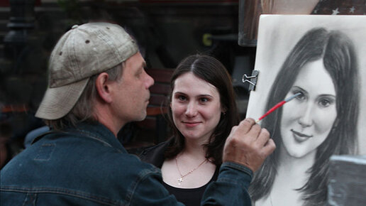Как правило в таких местах всегда присутствуют уличные художники, которые за определённую сумму денег рисовали портреты всем желающим. Чаще всего они рисовали карандашом, на что уходило не так много времени, по сравнению с маслом или техникой “сухой кисти”...