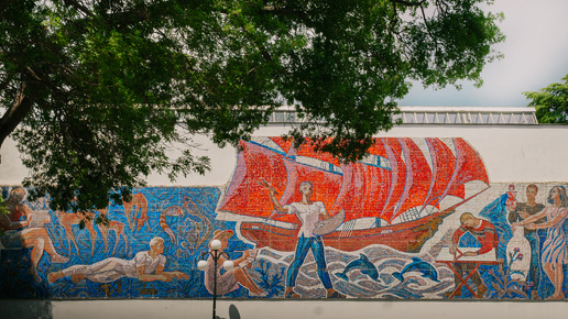 Предлагаю вам отправиться в путешествие по Ялте советской эпохи – эпохи, оставившей свой, часто недооцененный след в архитектуре и искусстве города, по следам советского человека. Адрес: улица Гоголя, 1. (44.489744, 34.161487) Год: 1967-68 Автор: Е.С. Зернова В 1967 году художница Е.С. Зернова и коллектив КДОИ создали для него мозаичные панно под общей темой "Мечты и труд художника...