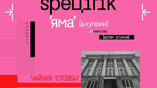 «Яма» — спектакль по мотивам повести А.И Куприна на фасаде чайной «Столбы». Режиссёр — Артём Устинов. Когда-то в этом доме проводился культурный эксперимент Максима Горького — клуб для бездомных и босяков, где они могли читать книги, слушать музыку и смотреть театральные постановки. Проект был утопическим, и до конца неизвестно, в какой степени он осуществился. Спектакль Артёма Устинова — о попытке просветить, окультурить, изменить. Насколько культура может изменить человека и может ли вообще?...