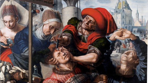 Перед нами картина фламандского художника Яна Сандерса ван Хемессена (1500-1566). На ней изображён так называемый "stone cutter / каменотёс", вымышленный тип хирурга из средневековой легенды. В ней человек по имени Лубберт Дас жаловался, что делает глупости. На что шарлатан убедил его, что источником его глупости является камень (камень безумия) в его голове. И если удалить камень, он перестанет быть глупцом. Эта история была очень популярна в средневековом искусстве, где она использовалась как символ глупости/абсурда/доверчивости...