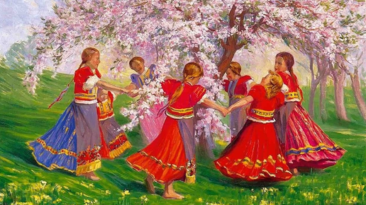 В танцах поселяне, все навеселе. Покупают парни у торговки дули,