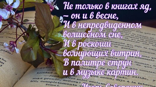 Ты говоришь, что книги — это яд, Что глубь душевную они мутят, Что после книг невыносима явь. «Избавь от книг, — ты говоришь, — избавь»... Не только в книгах яд, — он и в весне, И в непредвиденном волшебном сне, И в роскоши волнующих витрин, В палитре струн и в музыке картин. Вся жизнь вокруг, мой друг, поверь мне, яд - То сладостный, то горький. Твой напад На книги — заблужденье. Только тот Безоблачен, кто вовсе не живёт. Блистательно-нежный и утонченный Игорь Северянин - непревзойденный поэт Серебряного века, пожалуй, один из самых загадочных стихотворцев России...