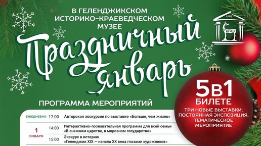 ✨ Когда отгремят новогодние ёлки и утренники, а праздничные застолья декабря останутся позади, и в длинные январские выходные вы захотите увлекательно провести время всей семьёй — вас будет ждать насыщенная интерактивная программа в Геленджикском историко-краеведческом музее. 🔥 Программа мероприятий 📅 1 января В 14:00 — интерактивно-познавательная программа для всей семьи «В снежном царстве, в морозном государстве». В 15:00 — экскурс в историю «Геленджик XIX — начала XX века глазами художников»...