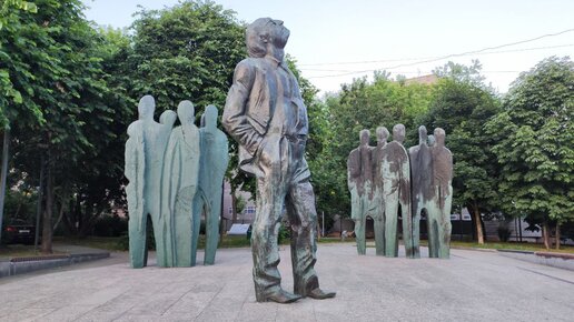 Памятник, может, и Бродскому, но он здесь явно не один. Давайте разбираться. С этого ракурса не видно, что фигура поэта плоская. Именно так: если вы подойдете сбоку, то сможете сами в этом убедиться. За ним две группы силуэтов, тоже плоских. Слева друзья, справа враги... или наоборот? Как и в жизни: сразу не поймешь. При этом Бродский рельефный, ярко выраженный, а все остальные безликие. «Эти люди — силуэты — то окружение, которое не только вокруг Бродского, а вокруг всех нас. Мы не существуем в одиночку...