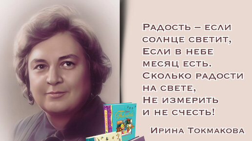 «У кого в детстве не бывает сказки, то вырастает сухим, колючим человеком, и люди об него ушибаются, как о лежащий на дороге камень, и укалываются, как о лист осота». (Ирина Токмакова) Славные книжки Ирины Токмаковой наверняка живут в каждом доме, где есть дети. Одно поколение вырастает, сменяется другим, третьим, а «Аля, Кляксич и буква А», «Сказка про Сазанчика», сказочные переводы «Муми-Троллей» Туве Янссон, «Винни-Пуха» Алана Милна, «Ветра в ивах» Кеннета Грема остаются с нами. Купите лук, зеленый лук, Петрушку и морковку, Купите нашу девочку, Шалунью и плутовку...