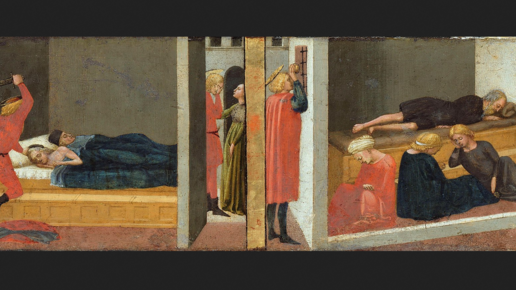 Неожиданно для себя я обнаружил в Берлинском музее семь частей полиптиха из церкви Кармине в Пизе, написанные Мазаччо и его учениками. Этот полиптих располагался там на алтаре и был потом утерян в связи с перестройкой здания. Картины же оказались в разных местах, и я был рад увидеть хотя бы часть из них в Берлине. Одна из панелей привлекла мое особое внимание, поскольку я не очень понял, о чем там речь. Мне показалось, что она посвящена одному сюжету, поскольку с обеих сторон там были изображены спящие люди, к тому же колористическое решение было очень гармоничным по всей панели...