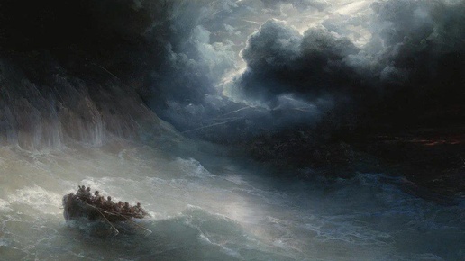 "🌊 Иван Константинович Айвазовский (1886) Россия Романтизм На картине изображено штормовое море вблизи скал, очертания которых теряются во мраке. Бушующее море сливается с грозовым небом. Из-за тёмных туч сверкают молнии. Атмосфера бури, гнева моря, передана так мощно, что зритель будто слышит грохот волн и раскаты грома. На переднем плане слева изображена лодка с людьми, спасающимися после кораблекрушения...