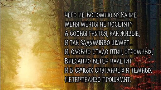 Как грустный взгляд, люблю я осень. В туманный, тихий день хожу Я часто в лес и там сижу — На небо белое гляжу Да на верхушки темных сосен. 🍂 Люблю, кусая кислый лист, С улыбкой развалясь ленивой, Мечтой заняться прихотливой Да слушать дятлов тонкий свист. 🍂 Трава завяла вся… холодный, Спокойный блеск разлит по ней… И грусти тихой и свободной Я предаюсь душою всей… 🍂 Чего не вспомню я? Какие Меня мечты не посетят? А сосны гнутся, как живые, И так задумчиво шумят… 🍂 И, словно стадо птиц огромных, Внезапно ветер налетит И в сучьях спутанных и темных Нетерпеливо прошумит...
