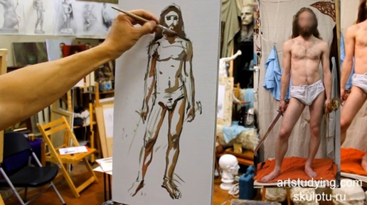 Для живописи обнаженной фигуры рекомендуется брать холст, натянутый на подрамник размером, ориентировочно, в один метр по большой стороне. Очень важно уметь расположить изображение на холсте. Для этого, после того как модель окончательно поставлена, рекомендую взять небольшой кусок темной бумаги и вырезать в ней прямоугольник приблизительно 5 Х 7 см, и это «окно» навести на модель, смотря в него одним глазом. Перемещая (Аудио этого поста здесь - (КОМПОЗИЦИЯ И РИСУНОК НА ХОЛСТЕ, ПРИЕМЫ РАБОТЫ МАСЛОМ 69-72 https://music...