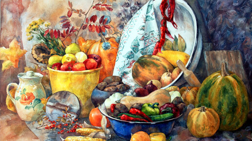 Технологии в акварели. Выполнение натюрморта "Плодородие" в технике Аля-прима акварелью по сырому листу.