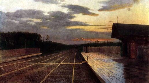 На этом полотне мы видим одинокий полустанок с деревянным настилом и открытой платформой. Вечереет, только что прошёл дождь. Вдали виднеется поезд, но пассажиров, ожидающих его нет. Это делает его ещё более одиноким и таинственным...