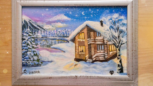 Тёплый и уютный зимний домик в котором светит тёплый свет, в окошко видны домашние кошки, которые любуются вечерним пушистым снегом из окна. Возле дома растёт берёза покрытая снегом. За домом открывается великолепный пейзаж с озером, вдалеке виднеется заснеженный лес с пушистыми снежными ёлочками и горы, тихо плывут облака, светят звёзды и месяц... Картины рисовались в подарок :) Дата создания: 21.01.2021 г. Материалы: холст на картоне 20 на 30 см фирмы "Малевич", акриловые краски "Таир", покрытие: акриловый лак "Таир", рамка...