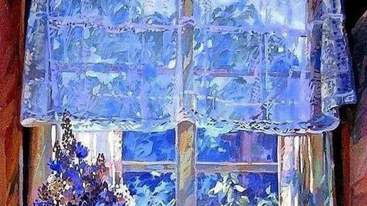 В простых окнах русских деревенских изб есть необыкновенная прелесть. И при взгляде на эту картину, где так много синего и голубого цветов, сразу вспоминается что-то Есенинское про «васильковую Русь»....