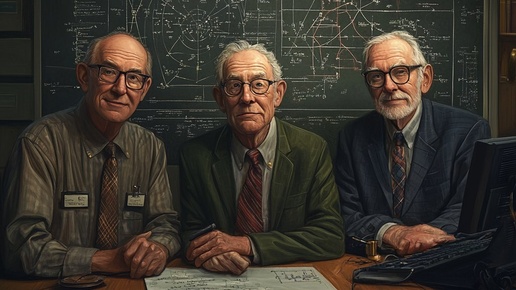 Создано на основе запроса: hyper-realistic composite image in Pixar style showing John McCarthy, Marvin Minsky, and Allen Newell. Each scientist is depicted in a professional yet approachable pose, with subtle elements representing their contributions to AI. McCarthy is shown with a chalkboard featuring early AI equations, Minsky with a neural network diagram in the background, and Newell with a computer displaying early AI programming...