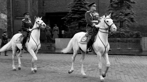 В финале нашего мини-цикла о параде 1945 года будет много архивных фото. Здесь же постараемся подвести итоги и вспомним о второй юбилейной дате. Какой? Узнаете в первых строках повествования. В заключительной публикации об участниках Парада Победы разберёмся с двумя оставшимися версиями о коне, на котором маршал Георгий Жуков объезжал войска во время торжественной церемонии. Серый жеребец Араб ахалтекинской породы был рождён в 1930 году. То есть на момент Парада Победы ему было 15 лет. Не слишком молодая лошадь, хотя ещё и не очень старая...
