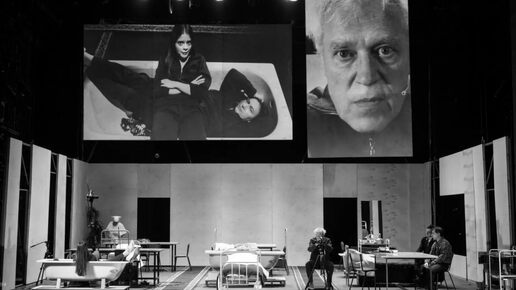 Театральное действо разворачивается в сценическом пространстве со столами, кроватями и даже как минимум с одной ванной. (В этой ванне Алевтина купает Переца ближе к концу спектакля, когда тот наконец-то заглянул к ней на огонек.) На сценическое пространство, кстати, я поглядывала не так уж часто. Вы спросите: почему? А потому, что самые интересные подробности проецировались на два сопряженным друг с другом экрана. Этим занимался специально обученный человек, передвигающийся по сцене. И в основном зрители смотрели не на фигурки на сцене, а именно на эти экраны...