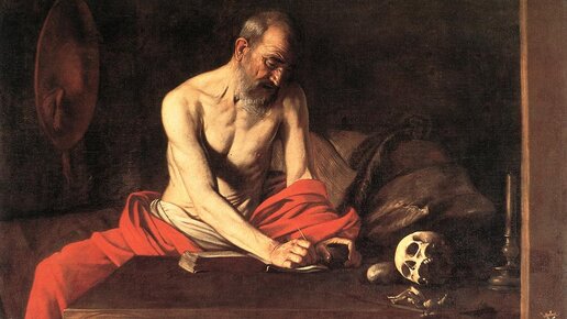 У Караваджо есть две картины, изображающие святого Иеронима - учителя Церкви и создателя Вульгаты, канонического перевода Библии на латинский язык. Одна картина датируется 1606 годом, вторая - 1608. Именно о ней я и поведу рассказ. Святой Иероним сидит в темной комнате, до такой степени погруженный в работу, что даже не замечает неловкости своей позы. Тога сползла с его плеча, закрыв руку. Сам же он, ещё недавно, как видно, меривший шагами комнату, в порыве вдохновения – а может, и откровения свыше – присел за стол, чтобы записать пришедшую в голову мысль...