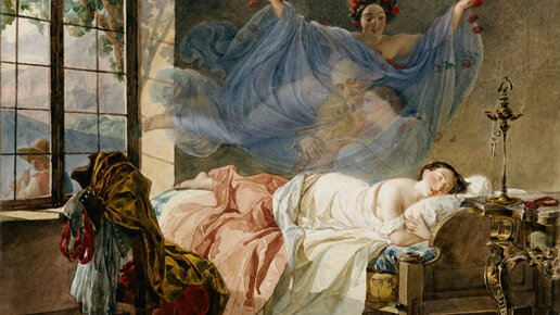 Добрый день, дорогие друзья! Перед Вами картина Карла Брюллова - "Сон молодой девушки перед рассветом" На картине мы видим прекрасную спящую девушку, которая видит сон... Над девушкой мы видим 4 фигуры... С фигурой в красном венке все понятно - это скорее всего богиня ночи, на ее голове - венок из маков ( а мы знаем, что мак - символ сна) Тогда кто же три оставшиеся фигуры в девушкином сне?! Давайте разбираться... Во сне девушка видит себя ( брюнетка), ее обнимает молодой человек с золотыми кудрями ( скорее всего, это ее жених)...
