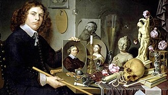 Вроде бы ничего необычного на картине. На ней изображен молодой человек. Судя по названию, сам художник Давид Байи. Он сидит за столом, уставленном символическими объектами, которые традиционно используются в жанре живописи Ванитас. Рядом с ним несколько картин. Это автопортрет самого художника Давида Байи...