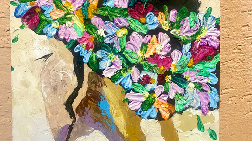 Однажды , я захотела нарисовать девушку . Эта задумка вызвала в моей душе отклик , и руки быстро с помощью мастихина , шпаклевки , акриловых красок , написали ее на деревянной дощечке . Это объемная выкладка цветов ( шпаклевкой ) , очень эффектно смотрится ...