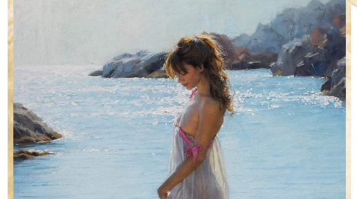 Полуобнаженная девушка, появляющаяся из моря, невольно отсылает к облику Афродиты пера Ботичелли. Нечто божественно-прекрасное есть в изящной фигуре героини. Поза, в которой девушка застенчиво прикрывается от зрителя, и цвет волос усиливают аналогию. Воздушная ткань едва просвечивает тонкие изгибы тела, взгляд опущен в легком смущении. Слегка заметная нагота смотрится натурально и естественно, играя романтичные ноты женского начала. На море полный штиль, а невысокие скалы скорее выполняют роль обрамления картины, создавая чувство защищенности и уюта...