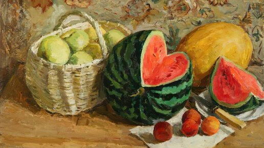 Уверена, что арбузы любит большинство людей. Наступает их сезон, поэтому решила сделать небольшую подборку картин с арбузами. Полотна очень красочные и привлекающие внимание. Смородина и арбуз "Смородина и арбуз" - картина, принадлежащая кисти Юлия Юльевича Клевера (младшего). Это сын знаменитого сын художника, профессора пейзажной живописи Юлия Юльевича Клевера. Картина была написана в 1914 году. Перед нами деревянный стол, на котором лежит разрезанный арбуз, рассыпанная красная смородина, несколько яблок, нож и кувшин...