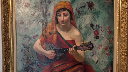 Взгляните на эти картины в одном из залов Национальной галереи Болгарии - на каждой их них есть что-нибудь красное. Давайте рассмотрим их поближе: Грустная женщина в ярко-красных одеяниях играет на домбре. О чем грустит красавица? Вроде бы одета богато, в доме есть и ковры, и богатые ткани. за спиной у девушки - яркий занавес, наверняка из дорогого шелка. Но вот грустит красавица, и ноги у неё поджаты, как будто боится чего-то. А не просватали ли её за нелюбимого? Судя по одеяниям, девушка восточная, а там, когда замуж отдают, невесту особо не спрашивают...