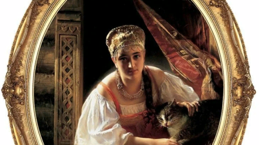 Картина "Русская красавица с кошкой" Константин Маковский, 1865 год, холст, масло, 115.5 x 92.7 см. Это картина известного русского художника, Константина Егоровича Маковского, выполненная в национальной тематике. В конце XIX - начале ХХ века в Российской Империи одним из самых популярных направлений в искусстве было изображение русских традиций и истории. У Маковского есть серия работ с русскими красавицами, где он обращается к бытовой стороне жизни Руси XVII века, передавая особенности декора и яркие детали прошлого...
