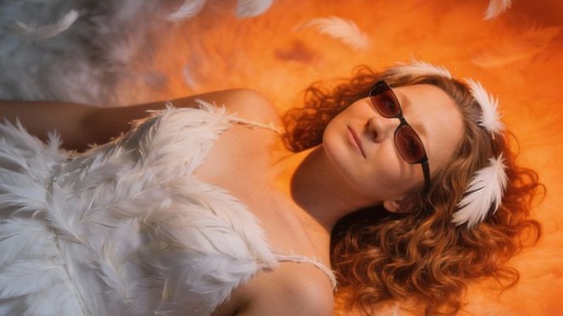 поверхности из перьев, окруженная большим количеством белых перьев. Перья словно парят в воздухе, они разлетаются вокруг неё. Девушка выглядит расслабленной, её глаза закрыты, а выражение лица спокойное и умиротворённое. Она одета в легкое белое платье, которое тоже усыпано перьями. В её волосах также виднеются перья, что добавляет дополнительный элемент эфемерности...