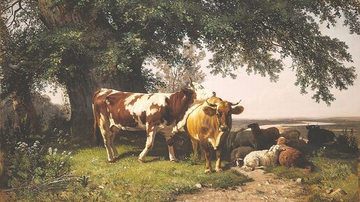 Показываем и рассказываем о колоритном полотне, написанном Иваном Ивановичем Шишкиным, под названием "Стадо под деревьями" (1864 г.) Обычно имя Ивана Шишкина (1832-1898 гг.) ассоциируется с восхитительно реалистичными и живописными пейзажами. Но также он замечательно рисовал животных. Особенно художник любил изображать коров. И тому подтверждение такие его произведения, как "Стадо коров на отдыхе" (1862-1864 гг.), "Бычок", (1863 г.) и, конечно, "Стадо под деревьями". Картина «Стадо под деревьями» – яркий пример раннего творчества Ивана Шишкина...