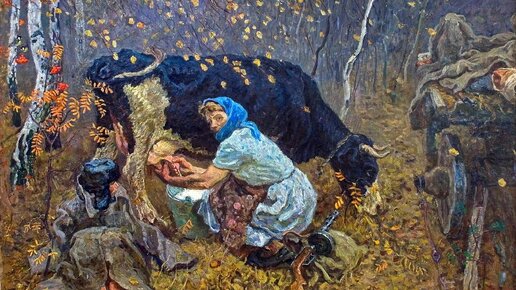 На этой картине мы видим женщину средних лет, которая находится в осеннем лесу с коровой и ребёнком. Давайте попробуем разобраться, что же заставило эту семью покинуть родной дом и перебраться в глухую чащу. Полотно создали живописцы Сергей и Алексей Ткачёвы, которые чаще всего работали в паре. Художники выбирали для своих картин простые жизненные сюжеты, в которых им позировали реальные люди. Не обошла братьев стороной и тема Великой отечественной войны, которой они посвятили цикл своих творений...