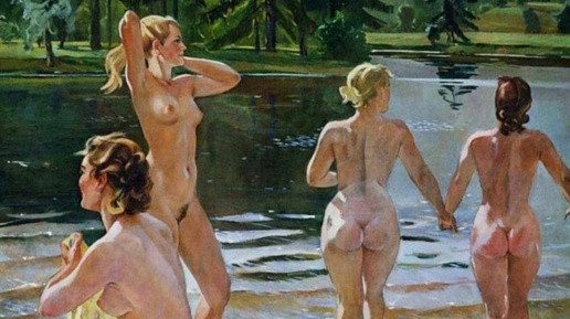 Про купальщиц точно можно сказать словами товарища Саахова: "Спортсменки, комсомолки, да к тому же ещё и красавицы". Во всяком случае образ Нины из фильма "Кавказская пленница", когда я смотрю на это полотно, у меня возникает. Мне кажется, эта картина могла бы составить пару другой его картине "Раздолье". Пробежались, искупались. Настолько фигуры женщин кажутся спортивными, подтянутыми, будто только что из спортзала. За счёт чего такой эффект получился? Безусловно, за счёт контуров тела. Посмотрите на позвоночник двух девушек справа...