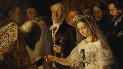 Перед нами картина Василия Пукирева - " Неравный Брак". Пукирев - гениальный художник. С одной стороны - мы видим простой сюжет, как молодая девушка выходит замуж за очень возрастного мужчину. С другой стороны - в картине много загадок и мистики... На картине мы видим не одну, а целых три невесты. Первая - молодая; вторая пожилая в венке, рядом с женихом; третья - пожилая женщина в венке, стоящая за спиной священника. Вы можете сказать, пожилые женщины - это гостьи на свадьбе! Нет, такого быть не...