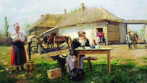 Картины Владимира Маковского славятся точным и метким воплощением бытовых сюжетов из жизни простых людей. Одно из самых известных подобных полотен — «Приезд учительницы в деревню». На нём мы видим двух женщин, одна из которых сидит за столом, а другая стоит за её спиной. Одна из них, как мы понимаем из названия картины, учительница — та, что сидит за столом возле сельского домика. Вторая, очевидно, хозяйка дома, в который приезжую определили на постой. Хозяйка спешит накормить гостью с дороги нехитрой деревенской едой: на столе огурцы, яйца, варёная картошка, чай, квас или молоко в крынке...