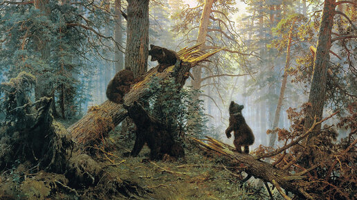 Эта замечательная картина знакома нам с детства. Озорных медвежат с медведицей мы помним по плюшевым коврам, гобеленам, школьным учебникам и, конечно же, по шоколадным конфетам. На полотне мы видим вековые сосны, прогнувшиеся от веса ветвей, которые ласково освещены пробуждающимися солнечными лучами. На поваленном дереве под надзором своей мамы играют медвежата. Сюжет делает картину живой, создавая атмосферу повседневной лесной жизни. В картине чувствуется и глубина оврагов, и запах хвои, и свежесть лесного утра...