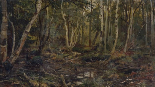Итак, картина первая. «Болото в лесу». 1880-е. Холст. масло. Елена рассказывает: «Болото в лесу – кладовая солнца! По сравнению с деревьями болота накапливают больше углерода, потому что деревья днем поглощают углекислый газ, а ночью частично его выделяют – дышат. Болото же, поглотив углерод, обратно его не отпускает, копит в себе торф под толщей воды...