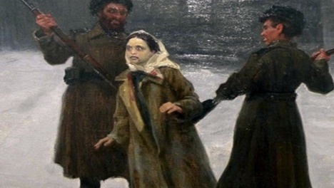Эта картина представляет нам реальный исторический эпизод, в котором принимала участие женщина по имени Сигида. Мы видим, как её ведут двое конвоиров, подталкивая прикладами. Однако с ней самой явно что-то не так — она почти не может идти и смотрит вперёд жутким взглядом...