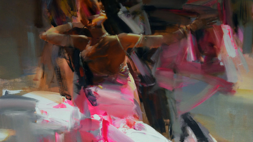 Нечеткие силуэты, широкие мазки, яркие краски - так передается настроение. Эта картина называется "Венский вальс". Я искала информацию, видео по технике этого танца. Вроде бы минимум фигур, всего-то 11, мы когда-то делали 4, а сейчас только одну, и то не получается! Не даётся нам этот вальс. Уж на что мой партнёр усердный в плане учёбы, но даже он впадает в уныние, когда в очередной раз ничего не получается. Так вот, искала теоретический материал, а напала на картину. И остановилась. Прекрасное мгновение...