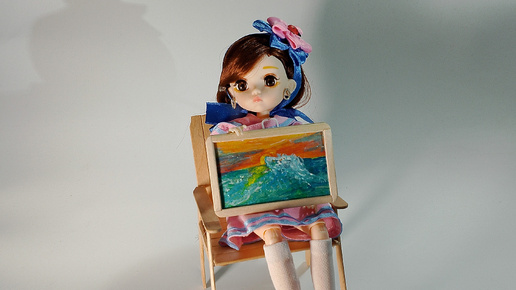 Сделаем картину в рамке для кукольного домика. Для картины понадобится палочка для мороженного, канцелярский или макетный нож, картон, клей, краски или картинка. Сначала сделаем детали для рамки. Разрежем палочку пополам. Дальше разрезаем каждую часть в желаемой пропорции. В нашем случае 4,5 см и 7 см. Мы решили оставить закруглённую часть у каждой детали. Обрабатываем каждую деталь наждачной бумагой. Наждачной бумагой делаем небольшое скругление у внутренней части, подобно внешней. Делаем ножом по краям небольшие пазы...