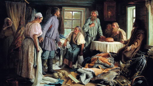 На этой картине мы видим большое количество людей в небольшом доме, которые что-то горячо обсуждают. Кругом валяются разные вещи, которые обитатели этого жилища, по всей вероятности, делят.