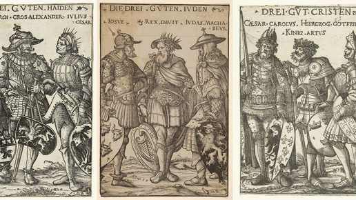 Перед нами комплект из 3 гравюр немецкого художника Ганса Бургкмайра Старшего (1473–1531). На них изображены так называемые "девять доблестных воинов" — 9 исторических и вымышленных персонажей, представляющих все моральные добродетели безупречного рыцаря. Изучение жизни каждого из этих воинов, таким образом, является правильным и хорошим делом для любого начинающего рыцаря...