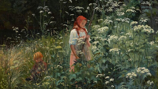 На картине мы видим крестьянскую девочку-подростка, которая стоит в зарослях высокой травы на опушке густого леса. Героиня одета в белую рубаху, красный сарафан и красный платок, выделяясь ярким пятном среди зелёной цветущей сныти. В руках девочка держит длинную палку, возможно с её помощью она пробирается через густые заросли. Рядом можно заметить мальчика, её брата, который сидит в густой траве. Высокие заросли практически скрыли паренька, и только по яркой одёжке можно увидеть очертания его фигуры...