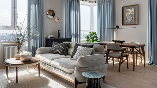 Несмотря на удачную планировку, прежний ремонт «под продажу» требовал полной переделки. Благодаря дизайнеру Евгении Самусевой интерьер приобрёл индивидуальный характер и выразительный стиль, вдохновлённый картиной Марка Шагала «Над городом». Диван, журнальный стол, обеденный стол и стулья — Boztas, ковёр — Divan.ru Панорамные окна квартиры стали продолжением шагаловского...