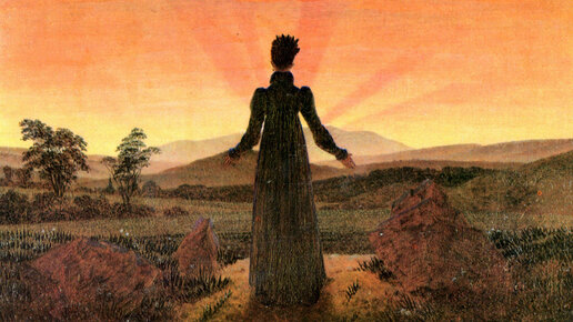 И расскажу я вам про две его любопытные работы. 1️⃣ "Девушка, наблюдающая рассвет ("Девушка, наблюдающая закат)", ок. 1818-1820. Музей Фолькванг, Эссен. Вот интересно. До сих пор нет единого мнения насчет названия этой работы. Часть исследователей утверждают, что перед нами "Девушка, наблюдающая рассвет", другие - "Девушка, наблюдающая закат". Версия первая. Рассвет (всегда про начало жизни): девушка в старонемецком платье выходит вперед, навстречу солнцу, подобно древним...
