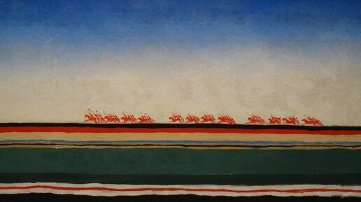 Из супрематического многообразия, созданного Казимиром Малевичем, выделяется одно полотно. Между небом и землёй на бескрайних просторах революционной страны несётся неведомо откуда и неведомо куда красная конница. Как не вспомнить Гоголя: «Эх, тройка! Птица тройка, кто тебя выдумал? Знать, у бойкого народа ты могла только родиться, в той земле, что не любит шутить, а ровнем-гладнем разметнулась на полсвета, да и ступай считать вёрсты, пока не зарябит тебе в очи». Линия горизонта смещена вниз, большая часть полотна отведена небу...