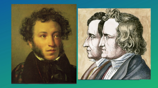 Братья Якоб и Вильгельм Гримм писали свои сказки, основанные на германском (и общеевропейском) фольклоре в первой трети XIX века. А.С. Пушкин писал свои сказки, основанные на русском (и тоже общеевропейском) фольклоре примерно в те же годы. Гримм просто прожили подольше нашего великого поэта, поэтому и годы их творчества более долгие. Сюжет о рыбаке и рыбке – как раз из общеевропейского наследия; конкретнее: это западнославянский сюжет – то есть, как раз такой, который был известен на западе Российской Империи и на востоке Пруссии...
